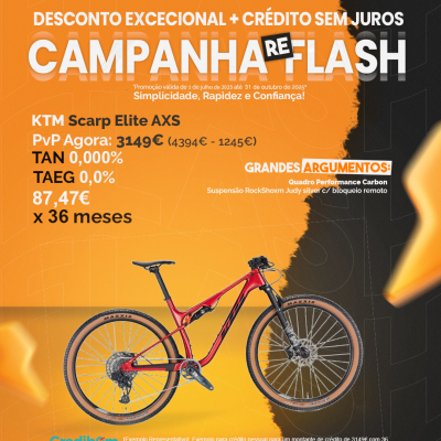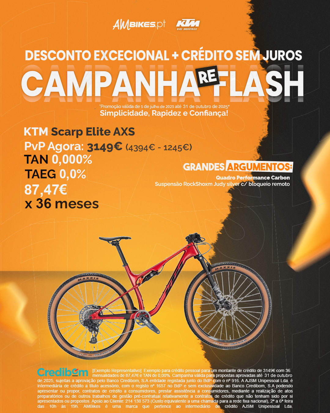 [Exemplo Representativo] Exemplo para crédito pessoal para um montante de crédito de 3149€ com 36 mensalidades de 87,47€ e TAN de 0,00%. Campanha válida para propostas aprovadas até 31 de outubro de 2025, sujeitas a aprovação pelo Banco Credibom, S.A entidade registada junto do BdP com o nº 916. A AJSM Unipessoal Lda. é intermediária de crédito a titulo acessório, com o registo nº 1657 no BdP e sem exclusividade ao Banco Credibom, S.A podendo apresentar ou propor, contratos de crédito a consumidores, prestar assistência a consumidores, mediante a realização de atos preparatórios ou de outros trabalhos de gestão pré-contratual relativamente a contratos de crédito que não tenham sido por si apresentados ou propostos. Apoio ao Cliente: 214 138 573 (Custo equivalente a uma chamada para a rede fixa nacional), 2ª a 6ª feira das 10h às 19h. AMBikes é uma marca que pertence ao intermediário de crédito AJSM Unipessoal Lda.