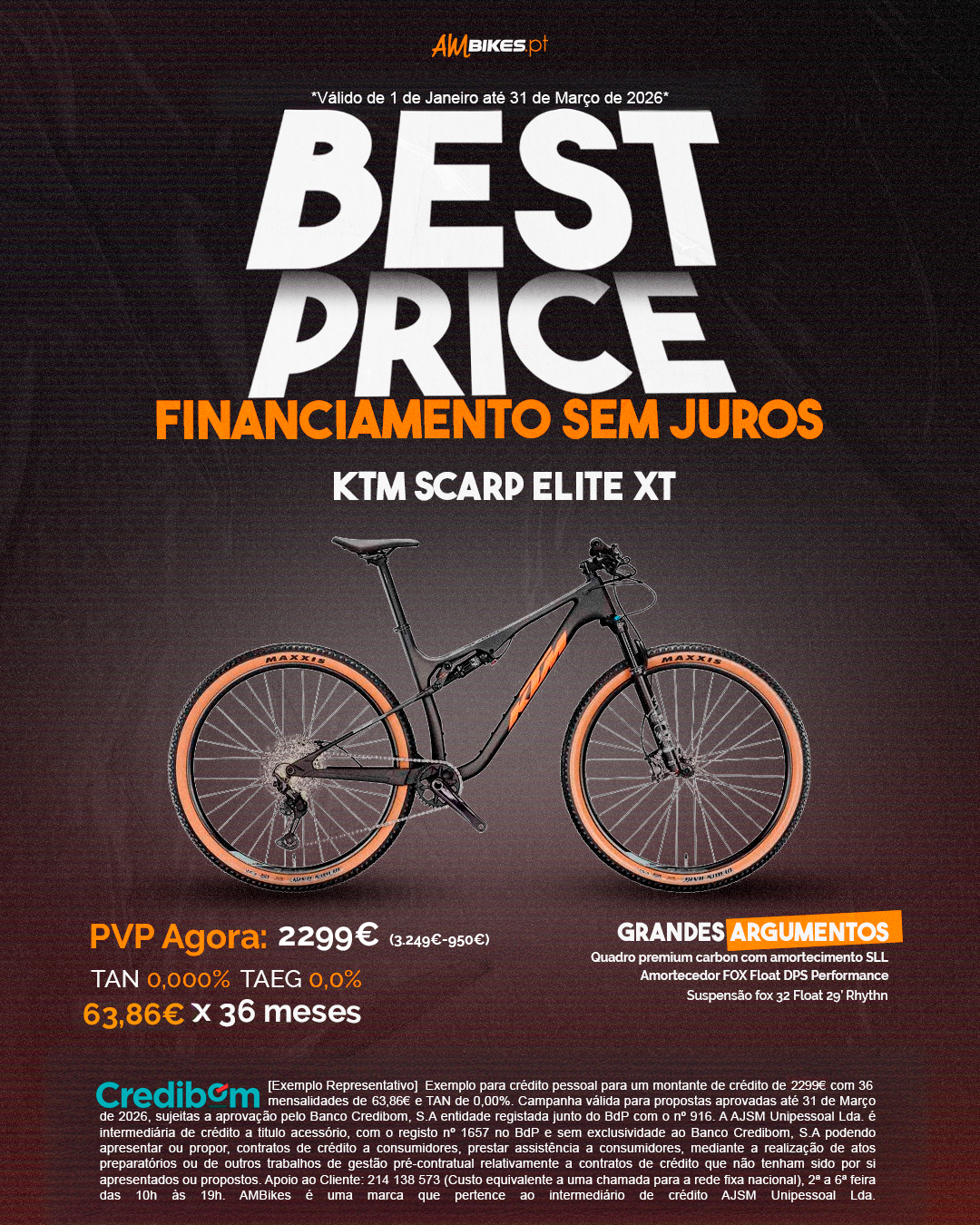 [Exemplo Representativo] Exemplo para crédito pessoal para um montante de crédito de 2.299€ com 36 mensalidades de 63,86€ e TAN de 0,00%. Campanha válida para propostas aprovadas até 31 de março de 2026, sujeitas a aprovação pelo Banco Credibom, S.A., entidade registada junto do BdP com o nº 916. A AJSM Unipessoal Lda. é intermediária de crédito a título acessório, com o registo nº 1657 no BdP e sem exclusividade ao Banco Credibom, S.A., podendo apresentar ou propor contratos de crédito a consumidores e prestar assistência pré-contratual. Apoio ao Cliente: 214 138 573 (custo de chamada para a rede fixa nacional), de 2ª a 6ª feira, das 10h às 19h. AMBikes é uma marca pertencente ao intermediário de crédito AJSM Unipessoal Lda.