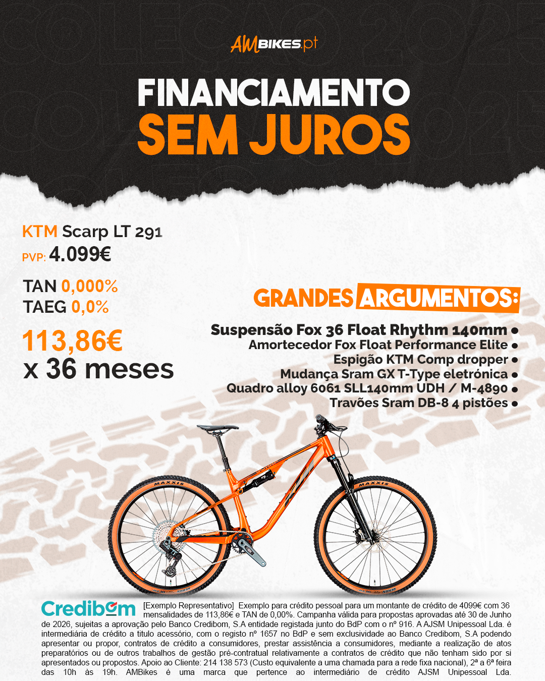 [Exemplo Representativo] Exemplo para crédito pessoal para um montante de crédito de 4099€ com 36 mensalidades de 113,86€ e TAN de 0,00%. Campanha válida para propostas aprovadas até 30 de junho de 2026, sujeitas a aprovação pelo Banco Credibom, S.A., entidade registada junto do BdP com o n.º 916. A AJSM Unipessoal Lda. é intermediária de crédito a título acessório, com o registo n.º 1657 no BdP e sem exclusividade ao Banco Credibom, S.A., podendo apresentar ou propor contratos de crédito a consumidores, prestar assistência a consumidores mediante a realização de atos preparatórios ou outros trabalhos de gestão pré-contratual relativamente a contratos de crédito que não tenham sido por si apresentados ou propostos. Apoio ao Cliente: 214 138 573 (chamada para a rede fixa nacional), 2ª a 6ª feira das 10h às 19h. AMBikes é uma marca que pertence ao intermediário de crédito AJSM Unipessoal Lda.