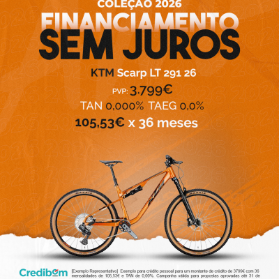 [Exemplo Representativo] Exemplo para crédito pessoal para um montante de crédito de 3.799,00 € com 36 mensalidades de 105,53€ e TAN de 0,00%. Campanha válida para propostas aprovadas até 31 de Dezembro de 2025, sujeitas a aprovação pelo Banco Credibom, S.A., entidade registada junto do BdP com o n.º 916. A AJSM Unipessoal Lda. é intermediária de crédito a título acessório, com o registo n.º 1657 no BdP e sem exclusividade ao Banco Credibom, S.A., podendo apresentar ou propor contratos de crédito a consumidores, prestar assistência a consumidores mediante a realização de atos preparatórios ou outros trabalhos de gestão pré-contratual relativamente a contratos de crédito que não tenham sido por si apresentados ou propostos. Apoio ao Cliente: 214 138 573 (chamada para a rede fixa nacional), 2ª a 6ª feira das 10h às 19h. AMBikes é uma marca que pertence ao intermediário de crédito AJSM Unipessoal Lda.