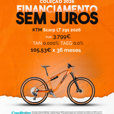 [Exemplo Representativo] Exemplo para crédito pessoal para um montante de crédito de 3.799,00 € com 36 mensalidades de 105,53€ e TAN de 0,00%. Campanha válida para propostas aprovadas até 31 de março de 2026, sujeitas a aprovação pelo Banco Credibom, S.A., entidade registada junto do BdP com o n.º 916. A AJSM Unipessoal Lda. é intermediária de crédito a título acessório, com o registo n.º 1657 no BdP e sem exclusividade ao Banco Credibom, S.A., podendo apresentar ou propor contratos de crédito a consumidores, prestar assistência a consumidores mediante a realização de atos preparatórios ou outros trabalhos de gestão pré-contratual relativamente a contratos de crédito que não tenham sido por si apresentados ou propostos. Apoio ao Cliente: 214 138 573 (chamada para a rede fixa nacional), 2ª a 6ª feira das 10h às 19h. AMBikes é uma marca que pertence ao intermediário de crédito AJSM Unipessoal Lda.