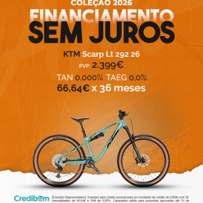 [Exemplo Representativo] Exemplo para crédito pessoal para um montante de crédito de 2.399,00 € com 36 mensalidades de 66,64 € e TAN de 0,00%. Campanha válida para propostas aprovadas até 31 de Dezembro de 2025, sujeitas a aprovação pelo Banco Credibom, S.A., entidade registada junto do BdP com o n.º 916. A AJSM Unipessoal Lda. é intermediária de crédito a título acessório, com o registo n.º 1657 no BdP e sem exclusividade ao Banco Credibom, S.A., podendo apresentar ou propor contratos de crédito a consumidores, prestar assistência a consumidores mediante a realização de atos preparatórios ou outros trabalhos de gestão pré-contratual relativamente a contratos de crédito que não tenham sido por si apresentados ou propostos. Apoio ao Cliente: 214 138 573 (chamada para a rede fixa nacional), 2ª a 6ª feira das 10h às 19h. AMBikes é uma marca que pertence ao intermediário de crédito AJSM Unipessoal Lda.
