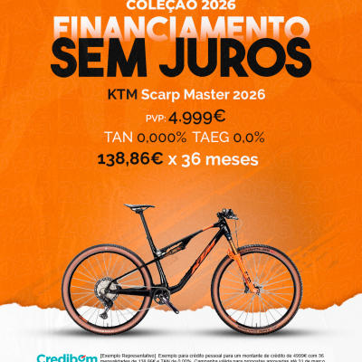 [Exemplo Representativo] Exemplo para crédito pessoal para um montante de crédito de 4.999,00 € com 36 mensalidades de 138,86€ e TAN de 0,00%. Campanha válida para propostas aprovadas até 31 de março de 2026, sujeitas a aprovação pelo Banco Credibom, S.A., entidade registada junto do BdP com o n.º 916. A AJSM Unipessoal Lda. é intermediária de crédito a título acessório, com o registo n.º 1657 no BdP e sem exclusividade ao Banco Credibom, S.A., podendo apresentar ou propor contratos de crédito a consumidores, prestar assistência a consumidores mediante a realização de atos preparatórios ou outros trabalhos de gestão pré-contratual relativamente a contratos de crédito que não tenham sido por si apresentados ou propostos. Apoio ao Cliente: 214 138 573 (chamada para a rede fixa nacional), 2ª a 6ª feira das 10h às 19h. AMBikes é uma marca que pertence ao intermediário de crédito AJSM Unipessoal Lda.