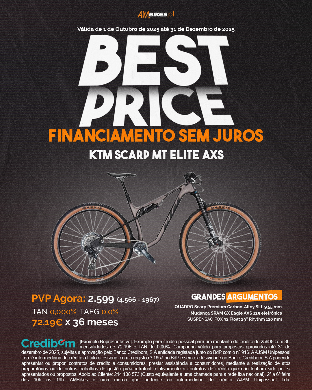 [Exemplo Representativo] Exemplo para crédito pessoal para um montante de crédito de 2.599€ com 36 mensalidades de 72,19€ e TAN de 0,00%. Campanha válida para propostas aprovadas até 31 de dezembro de 2025, sujeitas a aprovação pelo Banco Credibom, S.A entidade registada junto do BdP com o nº 916. A AJSM Unipessoal Lda. é intermediária de crédito a titulo acessório, com o registo nº 1657 no BdP e sem exclusividade ao Banco Credibom, S.A podendo apresentar ou propor, contratos de crédito a consumidores, prestar assistência a consumidores, mediante a realização de atos preparatórios ou de outros trabalhos de gestão pré-contratual relativamente a contratos de crédito que não tenham sido por si apresentados ou propostos. Apoio ao Cliente: 214 138 573 (Custo equivalente a uma chamada para a rede fixa nacional), 2ª a 6ª feira das 10h às 19h. AMBikes é uma marca que pertence ao intermediário de crédito AJSM Unipessoal Lda.