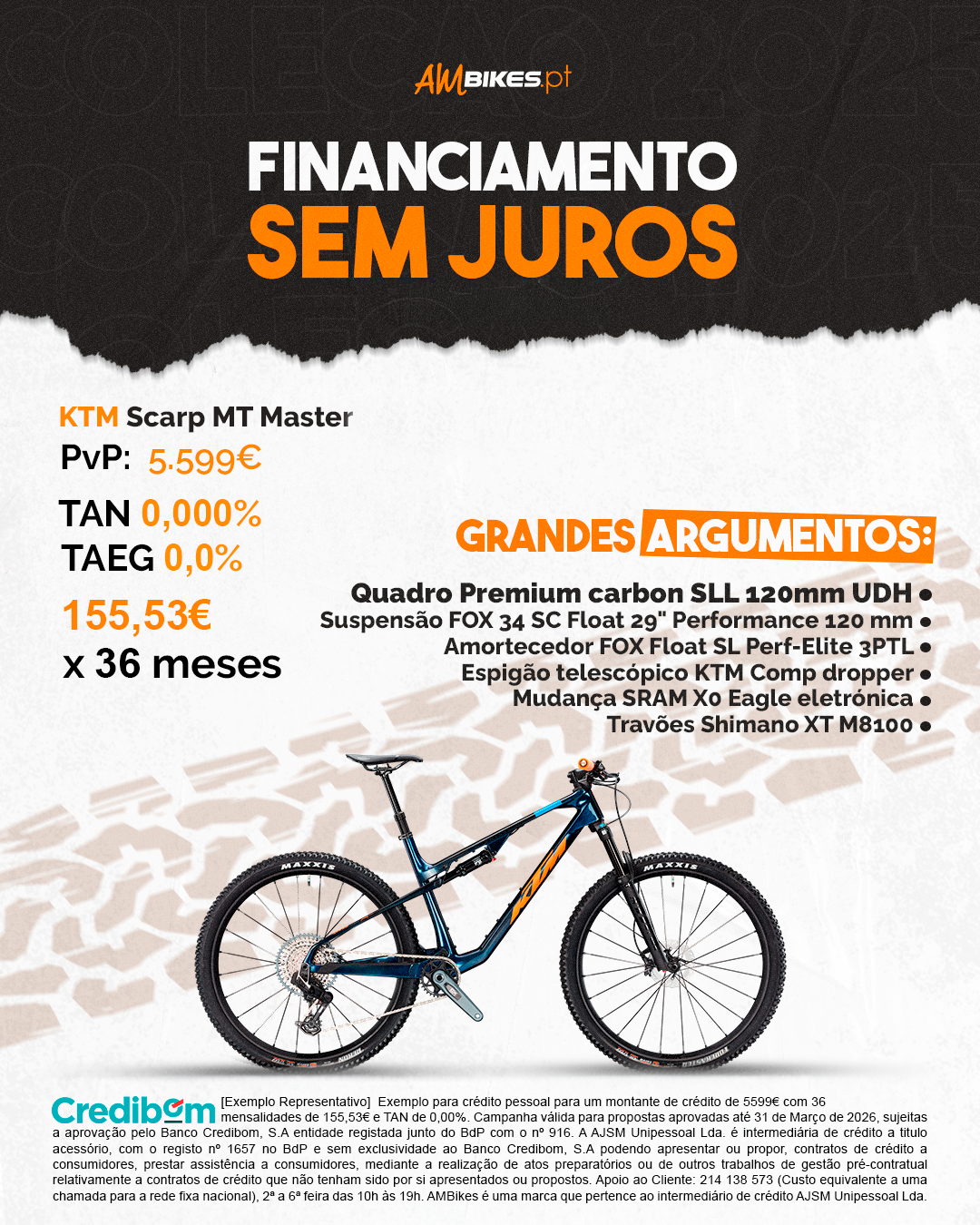 [Exemplo Representativo] Exemplo para crédito pessoal para um montante de crédito de 5599€ com 36 mensalidades de 155,53€ e TAN de 0,00%. Campanha válida para propostas aprovadas até 31 de março de 2026, sujeitas a aprovação pelo Banco Credibom, S.A entidade registada junto do BdP com o nº 916. A AJSM Unipessoal Lda. é intermediária de crédito a titulo acessório, com o registo nº 1657 no BdP e sem exclusividade ao Banco Credibom, S.A podendo apresentar ou propor, contratos de crédito a consumidores, prestar assistência a consumidores, mediante a realização de atos preparatórios ou de outros trabalhos de gestão pré-contratual relativamente a contratos de crédito que não tenham sido por si apresentados ou propostos. Apoio ao Cliente: 214 138 573 (Custo equivalente a uma chamada para a rede fixa nacional), 2ª a 6ª feira das 10h às 19h. AMBikes é uma marca que pertence ao intermediário de crédito AJSM Unipessoal Lda.
