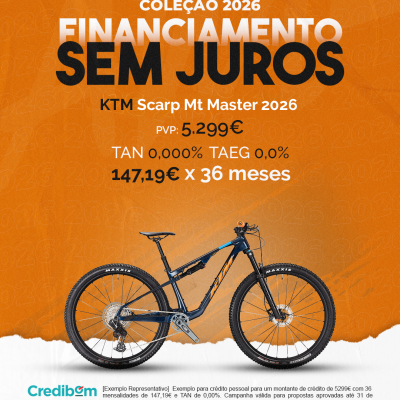 [Exemplo Representativo] Exemplo para crédito pessoal para um montante de crédito de 5.299,00 € com 36 mensalidades de 147,19 € e TAN de 0,00%. Campanha válida para propostas aprovadas até 31 de Dezembro de 2025, sujeitas a aprovação pelo Banco Credibom, S.A., entidade registada junto do BdP com o n.º 916. A AJSM Unipessoal Lda. é intermediária de crédito a título acessório, com o registo n.º 1657 no BdP e sem exclusividade ao Banco Credibom, S.A., podendo apresentar ou propor contratos de crédito a consumidores, prestar assistência a consumidores mediante a realização de atos preparatórios ou outros trabalhos de gestão pré-contratual relativamente a contratos de crédito que não tenham sido por si apresentados ou propostos. Apoio ao Cliente: 214 138 573 (chamada para a rede fixa nacional), 2ª a 6ª feira das 10h às 19h. AMBikes é uma marca que pertence ao intermediário de crédito AJSM Unipessoal Lda.