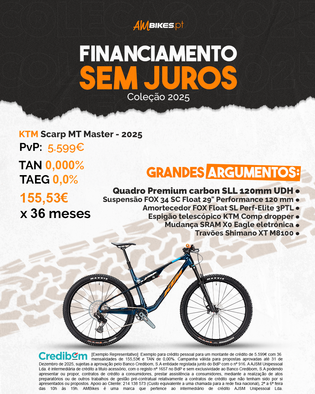 [Exemplo Representativo] Exemplo para crédito pessoal para um montante de crédito de 5599€ com 36 mensalidades de 155,53€ e TAN de 0,00%. Campanha válida para propostas aprovadas até 31 de Dezembro de 2025, sujeitas a aprovação pelo Banco Credibom, S.A entidade registada junto do BdP com o nº 916. A AJSM Unipessoal Lda. é intermediária de crédito a titulo acessório, com o registo nº 1657 no BdP e sem exclusividade ao Banco Credibom, S.A podendo apresentar ou propor, contratos de crédito a consumidores, prestar assistência a consumidores, mediante a realização de atos preparatórios ou de outros trabalhos de gestão pré-contratual relativamente a contratos de crédito que não tenham sido por si apresentados ou propostos. Apoio ao Cliente: 214 138 573 (Custo equivalente a uma chamada para a rede fixa nacional), 2ª a 6ª feira das 10h às 19h. AMBikes é uma marca que pertence ao intermediário de crédito AJSM Unipessoal Lda.