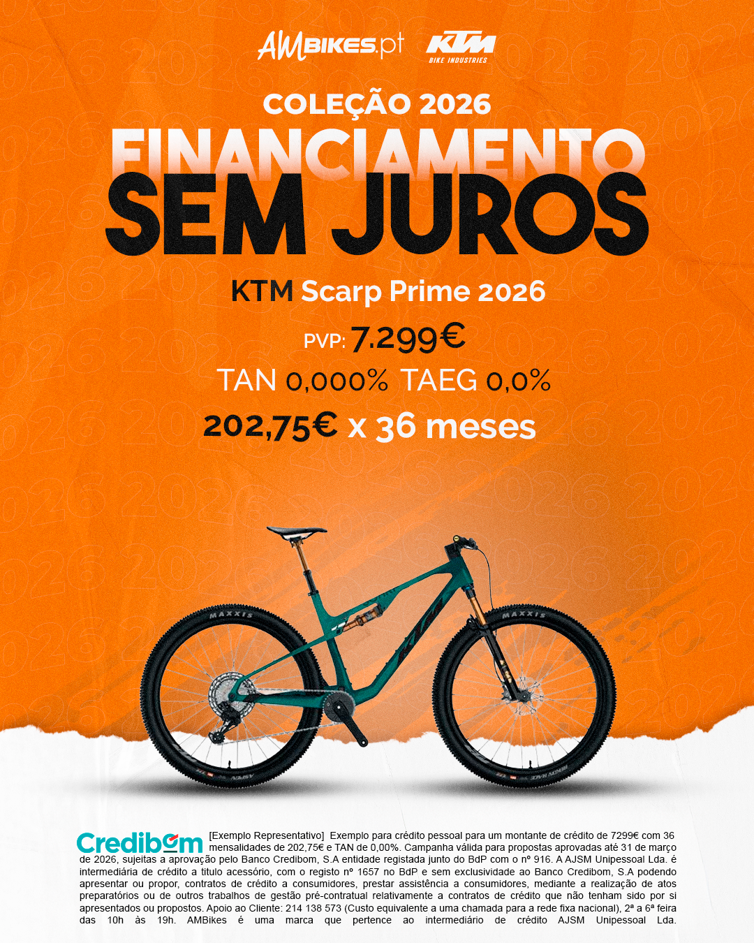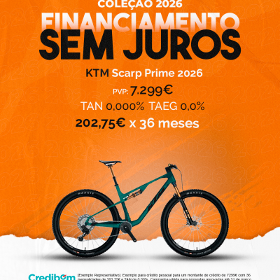 [Exemplo Representativo] Exemplo para crédito pessoal para um montante de crédito de 7.299,00 € com 36 mensalidades de 202,75€ e TAN de 0,00%. Campanha válida para propostas aprovadas até 31 de março de 2026, sujeitas a aprovação pelo Banco Credibom, S.A., entidade registada junto do BdP com o n.º 916. A AJSM Unipessoal Lda. é intermediária de crédito a título acessório, com o registo n.º 1657 no BdP e sem exclusividade ao Banco Credibom, S.A., podendo apresentar ou propor contratos de crédito a consumidores, prestar assistência a consumidores mediante a realização de atos preparatórios ou outros trabalhos de gestão pré-contratual relativamente a contratos de crédito que não tenham sido por si apresentados ou propostos. Apoio ao Cliente: 214 138 573 (chamada para a rede fixa nacional), 2ª a 6ª feira das 10h às 19h. AMBikes é uma marca que pertence ao intermediário de crédito AJSM Unipessoal Lda.