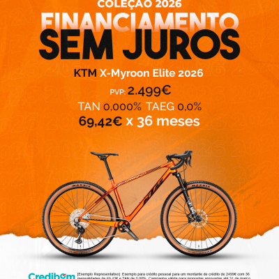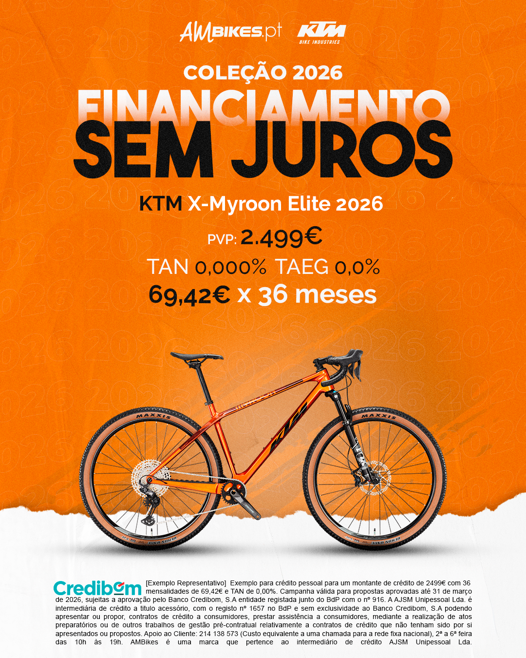 [Exemplo Representativo] Exemplo para crédito pessoal para um montante de crédito de 2.499,00 € com 36 mensalidades de 69,42 € e TAN de 0,00%. Campanha válida para propostas aprovadas até 31 de março de 2026, sujeitas a aprovação pelo Banco Credibom, S.A., entidade registada junto do BdP com o n.º 916. A AJSM Unipessoal Lda. é intermediária de crédito a título acessório, com o registo n.º 1657 no BdP e sem exclusividade ao Banco Credibom, S.A., podendo apresentar ou propor contratos de crédito a consumidores, prestar assistência a consumidores mediante a realização de atos preparatórios ou outros trabalhos de gestão pré-contratual relativamente a contratos de crédito que não tenham sido por si apresentados ou propostos. Apoio ao Cliente: 214 138 573 (chamada para a rede fixa nacional), 2ª a 6ª feira das 10h às 19h. AMBikes é uma marca que pertence ao intermediário de crédito AJSM Unipessoal Lda.