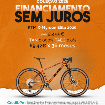 [Exemplo Representativo] Exemplo para crédito pessoal para um montante de crédito de 2.499,00 € com 36 mensalidades de 69,42 € e TAN de 0,00%. Campanha válida para propostas aprovadas até 31 de Dezembro de 2025, sujeitas a aprovação pelo Banco Credibom, S.A., entidade registada junto do BdP com o n.º 916. A AJSM Unipessoal Lda. é intermediária de crédito a título acessório, com o registo n.º 1657 no BdP e sem exclusividade ao Banco Credibom, S.A., podendo apresentar ou propor contratos de crédito a consumidores, prestar assistência a consumidores mediante a realização de atos preparatórios ou outros trabalhos de gestão pré-contratual relativamente a contratos de crédito que não tenham sido por si apresentados ou propostos. Apoio ao Cliente: 214 138 573 (chamada para a rede fixa nacional), 2ª a 6ª feira das 10h às 19h. AMBikes é uma marca que pertence ao intermediário de crédito AJSM Unipessoal Lda.