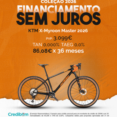 [Exemplo Representativo] Exemplo para crédito pessoal para um montante de crédito de 3099€ com 36 mensalidades de 86,08€ e TAN de 0,00%. Campanha válida para propostas aprovadas até 31 de Dezembro de 2025, sujeitas a aprovação pelo Banco Credibom, S.A entidade registada junto do BdP com o nº 916. A AJSM Unipessoal Lda. é intermediária de crédito a titulo acessório, com o registo nº 1657 no BdP e sem exclusividade ao Banco Credibom, S.A podendo apresentar ou propor, contratos de crédito a consumidores, prestar assistência a consumidores, mediante a realização de atos preparatórios ou de outros trabalhos de gestão pré-contratual relativamente a contratos de crédito que não tenham sido por si apresentados ou propostos. Apoio ao Cliente: 214 138 573 (Custo equivalente a uma chamada para a rede fixa nacional), 2ª a 6ª feira das 10h às 19h. AMBikes é uma marca que pertence ao intermediário de crédito AJSM Unipessoal Lda.