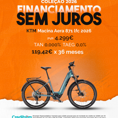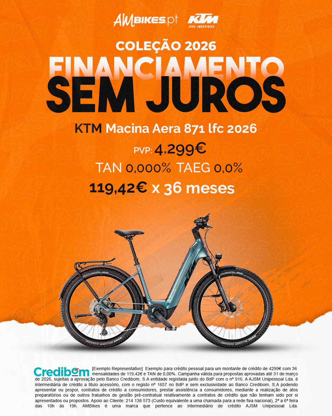 [Exemplo Representativo] Exemplo para crédito pessoal para um montante de crédito de 4.299,00 € com 36 mensalidades de 119,42 € e TAN de 0,00%. Campanha válida para propostas aprovadas até 31 de março de 2026, sujeitas a aprovação pelo Banco Credibom, S.A., entidade registada junto do BdP com o n.º 916. A AJSM Unipessoal Lda. é intermediária de crédito a título acessório, com o registo n.º 1657 no BdP e sem exclusividade ao Banco Credibom, S.A., podendo apresentar ou propor contratos de crédito a consumidores, prestar assistência a consumidores mediante a realização de atos preparatórios ou outros trabalhos de gestão pré-contratual relativamente a contratos de crédito que não tenham sido por si apresentados ou propostos. Apoio ao Cliente: 214 138 573 (chamada para a rede fixa nacional), 2ª a 6ª feira das 10h às 19h. AMBikes é uma marca que pertence ao intermediário de crédito AJSM Unipessoal Lda.