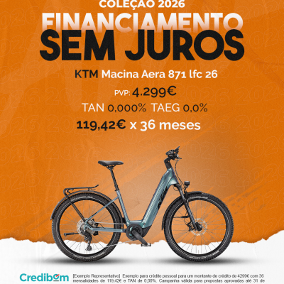 [Exemplo Representativo] Exemplo para crédito pessoal para um montante de crédito de 4.299,00 € com 36 mensalidades de 119,42 € e TAN de 0,00%. Campanha válida para propostas aprovadas até 31 de Dezembro de 2025, sujeitas a aprovação pelo Banco Credibom, S.A., entidade registada junto do BdP com o n.º 916. A AJSM Unipessoal Lda. é intermediária de crédito a título acessório, com o registo n.º 1657 no BdP e sem exclusividade ao Banco Credibom, S.A., podendo apresentar ou propor contratos de crédito a consumidores, prestar assistência a consumidores mediante a realização de atos preparatórios ou outros trabalhos de gestão pré-contratual relativamente a contratos de crédito que não tenham sido por si apresentados ou propostos. Apoio ao Cliente: 214 138 573 (chamada para a rede fixa nacional), 2ª a 6ª feira das 10h às 19h. AMBikes é uma marca que pertence ao intermediário de crédito AJSM Unipessoal Lda.