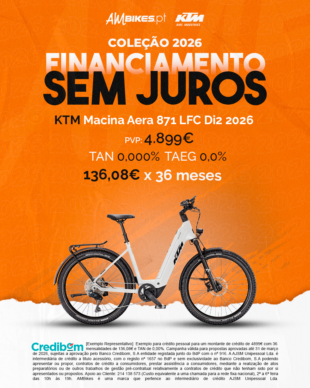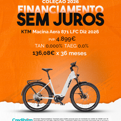 [Exemplo Representativo] Exemplo para crédito pessoal para um montante de crédito de 4.899,00 € com 36 mensalidades de 136,08 € e TAN de 0,00%. Campanha válida para propostas aprovadas até 31 de março de 2026, sujeitas a aprovação pelo Banco Credibom, S.A., entidade registada junto do BdP com o n.º 916. A AJSM Unipessoal Lda. é intermediária de crédito a título acessório, com o registo n.º 1657 no BdP e sem exclusividade ao Banco Credibom, S.A., podendo apresentar ou propor contratos de crédito a consumidores, prestar assistência a consumidores mediante a realização de atos preparatórios ou outros trabalhos de gestão pré-contratual relativamente a contratos de crédito que não tenham sido por si apresentados ou propostos. Apoio ao Cliente: 214 138 573 (chamada para a rede fixa nacional), 2ª a 6ª feira das 10h às 19h. AMBikes é uma marca que pertence ao intermediário de crédito AJSM Unipessoal Lda.