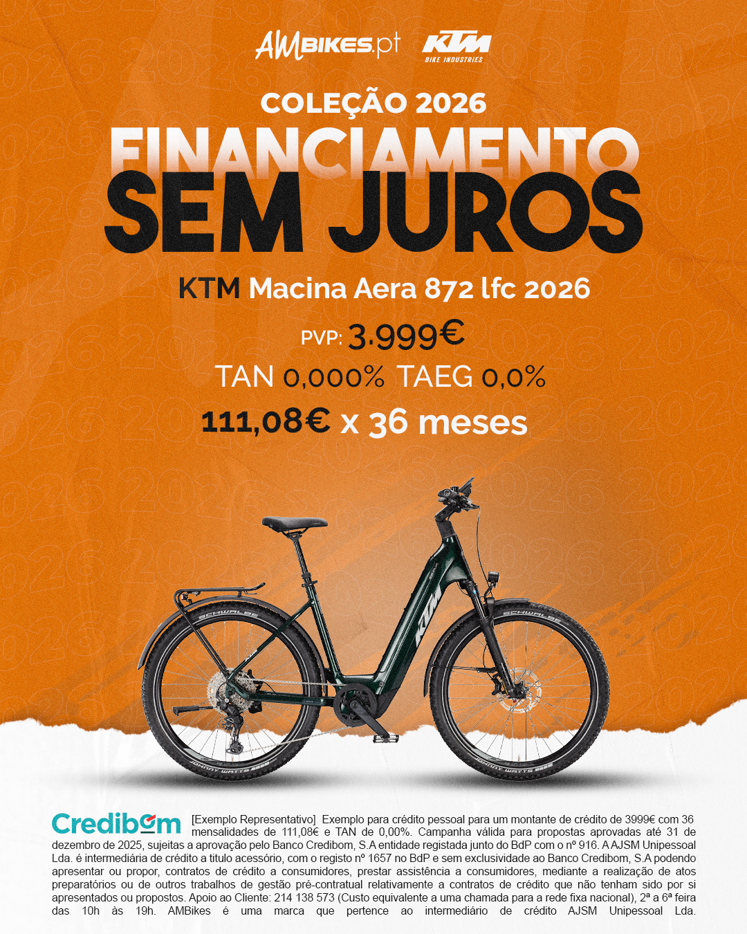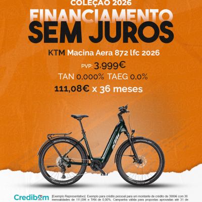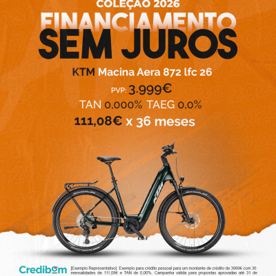 [Exemplo Representativo] Exemplo para crédito pessoal para um montante de crédito de 3.999,00 € com 36 mensalidades de 111,08 € e TAN de 0,00%. Campanha válida para propostas aprovadas até 31 de Dezembro de 2025, sujeitas a aprovação pelo Banco Credibom, S.A., entidade registada junto do BdP com o n.º 916. A AJSM Unipessoal Lda. é intermediária de crédito a título acessório, com o registo n.º 1657 no BdP e sem exclusividade ao Banco Credibom, S.A., podendo apresentar ou propor contratos de crédito a consumidores, prestar assistência a consumidores mediante a realização de atos preparatórios ou outros trabalhos de gestão pré-contratual relativamente a contratos de crédito que não tenham sido por si apresentados ou propostos. Apoio ao Cliente: 214 138 573 (chamada para a rede fixa nacional), 2ª a 6ª feira das 10h às 19h. AMBikes é uma marca que pertence ao intermediário de crédito AJSM Unipessoal Lda.
