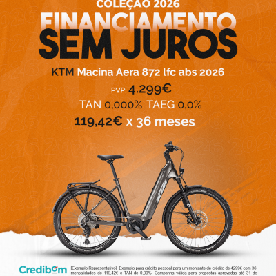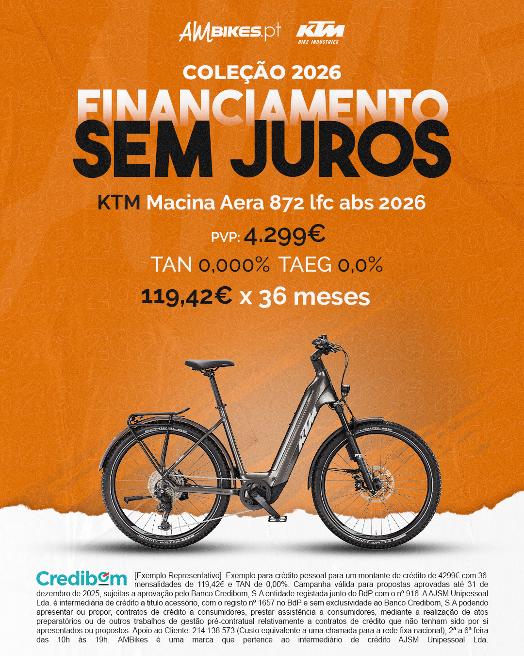 [Exemplo Representativo] Exemplo para crédito pessoal para um montante de crédito de 4.299,00 € com 36 mensalidades de 119,42 € e TAN de 0,00%. Campanha válida para propostas aprovadas até 31 de Dezembro de 2025, sujeitas a aprovação pelo Banco Credibom, S.A., entidade registada junto do BdP com o n.º 916. A AJSM Unipessoal Lda. é intermediária de crédito a título acessório, com o registo n.º 1657 no BdP e sem exclusividade ao Banco Credibom, S.A., podendo apresentar ou propor contratos de crédito a consumidores, prestar assistência a consumidores mediante a realização de atos preparatórios ou outros trabalhos de gestão pré-contratual relativamente a contratos de crédito que não tenham sido por si apresentados ou propostos. Apoio ao Cliente: 214 138 573 (chamada para a rede fixa nacional), 2ª a 6ª feira das 10h às 19h. AMBikes é uma marca que pertence ao intermediário de crédito AJSM Unipessoal Lda.