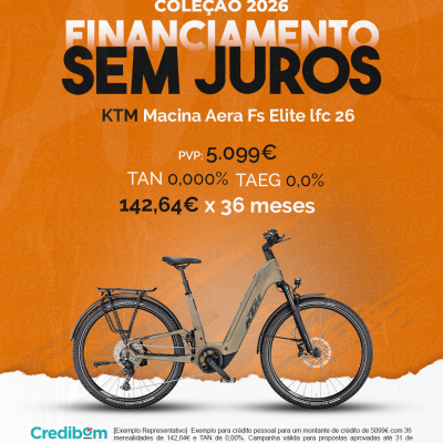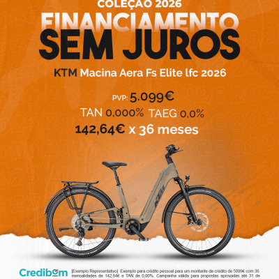 [Exemplo Representativo] Exemplo para crédito pessoal para um montante de crédito de 5.099,00 € com 36 mensalidades de 141,64 € e TAN de 0,00%. Campanha válida para propostas aprovadas até 31 de Dezembro de 2025, sujeitas a aprovação pelo Banco Credibom, S.A., entidade registada junto do BdP com o n.º 916. A AJSM Unipessoal Lda. é intermediária de crédito a título acessório, com o registo n.º 1657 no BdP e sem exclusividade ao Banco Credibom, S.A., podendo apresentar ou propor contratos de crédito a consumidores, prestar assistência a consumidores mediante a realização de atos preparatórios ou outros trabalhos de gestão pré-contratual relativamente a contratos de crédito que não tenham sido por si apresentados ou propostos. Apoio ao Cliente: 214 138 573 (chamada para a rede fixa nacional), 2ª a 6ª feira das 10h às 19h. AMBikes é uma marca que pertence ao intermediário de crédito AJSM Unipessoal Lda.