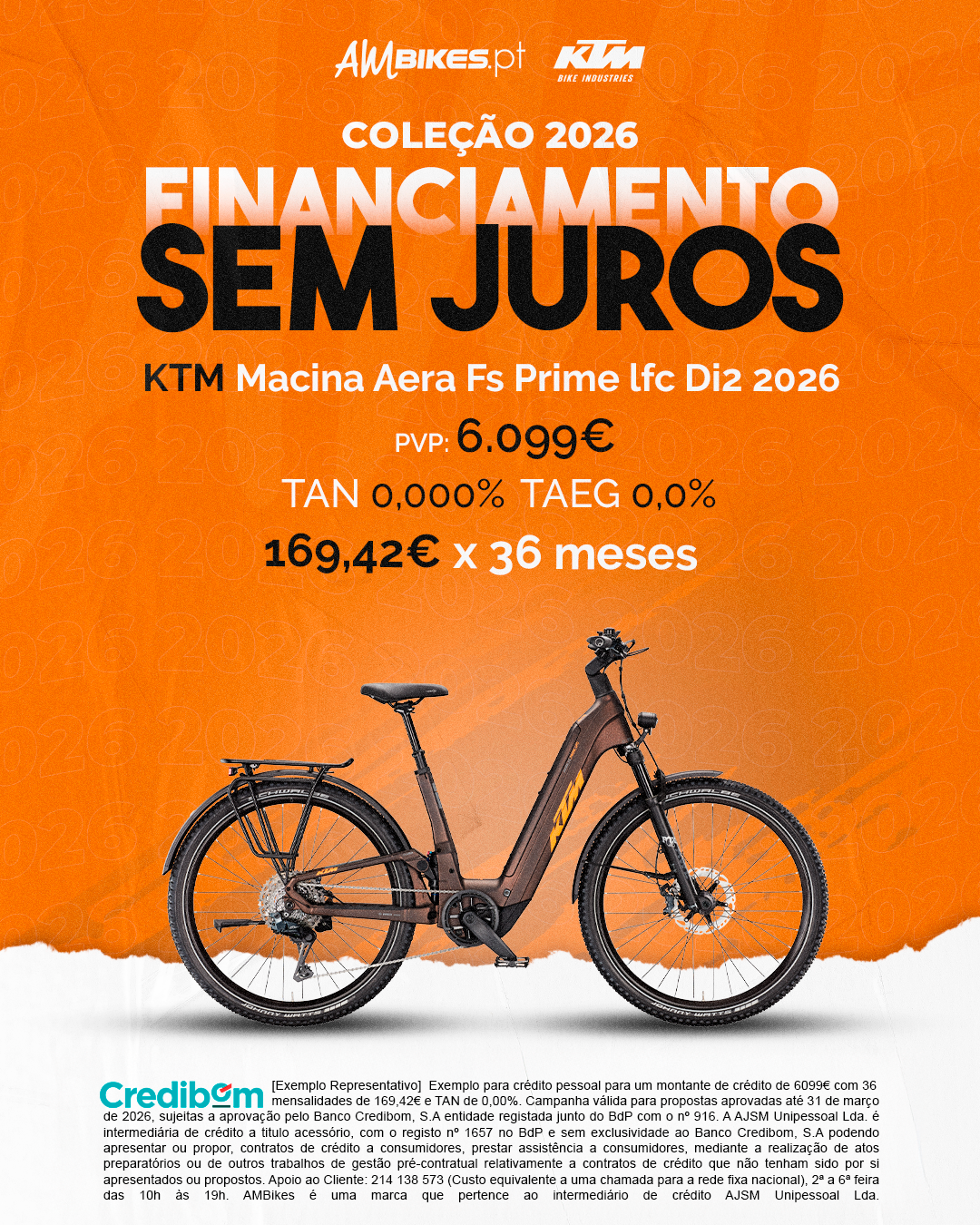 [Exemplo Representativo] Exemplo para crédito pessoal para um montante de crédito de 6.099,00 € com 36 mensalidades de 169,42 € e TAN de 0,00%. Campanha válida para propostas aprovadas até 31 de março de 2026, sujeitas a aprovação pelo Banco Credibom, S.A., entidade registada junto do BdP com o n.º 916. A AJSM Unipessoal Lda. é intermediária de crédito a título acessório, com o registo n.º 1657 no BdP e sem exclusividade ao Banco Credibom, S.A., podendo apresentar ou propor contratos de crédito a consumidores, prestar assistência a consumidores mediante a realização de atos preparatórios ou outros trabalhos de gestão pré-contratual relativamente a contratos de crédito que não tenham sido por si apresentados ou propostos. Apoio ao Cliente: 214 138 573 (chamada para a rede fixa nacional), 2ª a 6ª feira das 10h às 19h. AMBikes é uma marca que pertence ao intermediário de crédito AJSM Unipessoal Lda.