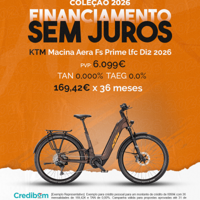 [Exemplo Representativo] Exemplo para crédito pessoal para um montante de crédito de 6.099,00 € com 36 mensalidades de 169,42 € e TAN de 0,00%. Campanha válida para propostas aprovadas até 31 de Dezembro de 2025, sujeitas a aprovação pelo Banco Credibom, S.A., entidade registada junto do BdP com o n.º 916. A AJSM Unipessoal Lda. é intermediária de crédito a título acessório, com o registo n.º 1657 no BdP e sem exclusividade ao Banco Credibom, S.A., podendo apresentar ou propor contratos de crédito a consumidores, prestar assistência a consumidores mediante a realização de atos preparatórios ou outros trabalhos de gestão pré-contratual relativamente a contratos de crédito que não tenham sido por si apresentados ou propostos. Apoio ao Cliente: 214 138 573 (chamada para a rede fixa nacional), 2ª a 6ª feira das 10h às 19h. AMBikes é uma marca que pertence ao intermediário de crédito AJSM Unipessoal Lda.