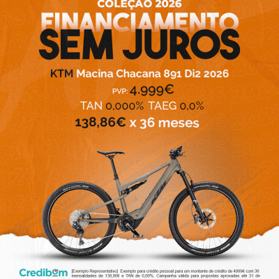 [Exemplo Representativo] Exemplo para crédito pessoal para um montante de crédito de 4.999,00 € com 36 mensalidades de 138,86 € e TAN de 0,00%. Campanha válida para propostas aprovadas até 31 de Dezembro de 2025, sujeitas a aprovação pelo Banco Credibom, S.A., entidade registada junto do BdP com o n.º 916. A AJSM Unipessoal Lda. é intermediária de crédito a título acessório, com o registo n.º 1657 no BdP e sem exclusividade ao Banco Credibom, S.A., podendo apresentar ou propor contratos de crédito a consumidores, prestar assistência a consumidores mediante a realização de atos preparatórios ou outros trabalhos de gestão pré-contratual relativamente a contratos de crédito que não tenham sido por si apresentados ou propostos. Apoio ao Cliente: 214 138 573 (chamada para a rede fixa nacional), 2ª a 6ª feira das 10h às 19h. AMBikes é uma marca que pertence ao intermediário de crédito AJSM Unipessoal Lda.