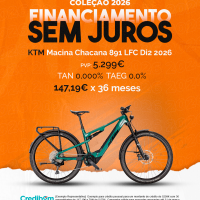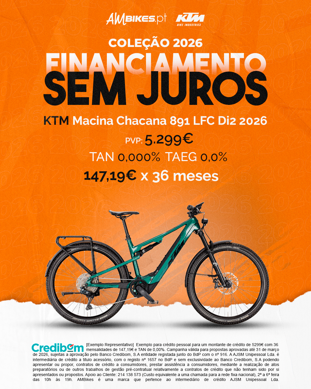 [Exemplo Representativo] Exemplo para crédito pessoal para um montante de crédito de 5.299,00 € com 36 mensalidades de 147,19 € e TAN de 0,00%. Campanha válida para propostas aprovadas até 31 de março de 2026, sujeitas a aprovação pelo Banco Credibom, S.A., entidade registada junto do BdP com o n.º 916. A AJSM Unipessoal Lda. é intermediária de crédito a título acessório, com o registo n.º 1657 no BdP e sem exclusividade ao Banco Credibom, S.A., podendo apresentar ou propor contratos de crédito a consumidores, prestar assistência a consumidores mediante a realização de atos preparatórios ou outros trabalhos de gestão pré-contratual relativamente a contratos de crédito que não tenham sido por si apresentados ou propostos. Apoio ao Cliente: 214 138 573 (chamada para a rede fixa nacional), 2ª a 6ª feira das 10h às 19h. AMBikes é uma marca que pertence ao intermediário de crédito AJSM Unipessoal Lda.