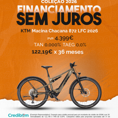[Exemplo Representativo] Exemplo para crédito pessoal para um montante de crédito de 4.399,00 € com 36 mensalidades de 122,19 € e TAN de 0,00%. Campanha válida para propostas aprovadas até 31 de Dezembro de 2025, sujeitas a aprovação pelo Banco Credibom, S.A., entidade registada junto do BdP com o n.º 916. A AJSM Unipessoal Lda. é intermediária de crédito a título acessório, com o registo n.º 1657 no BdP e sem exclusividade ao Banco Credibom, S.A., podendo apresentar ou propor contratos de crédito a consumidores, prestar assistência a consumidores mediante a realização de atos preparatórios ou outros trabalhos de gestão pré-contratual relativamente a contratos de crédito que não tenham sido por si apresentados ou propostos. Apoio ao Cliente: 214 138 573 (chamada para a rede fixa nacional), 2ª a 6ª feira das 10h às 19h. AMBikes é uma marca que pertence ao intermediário de crédito AJSM Unipessoal Lda.