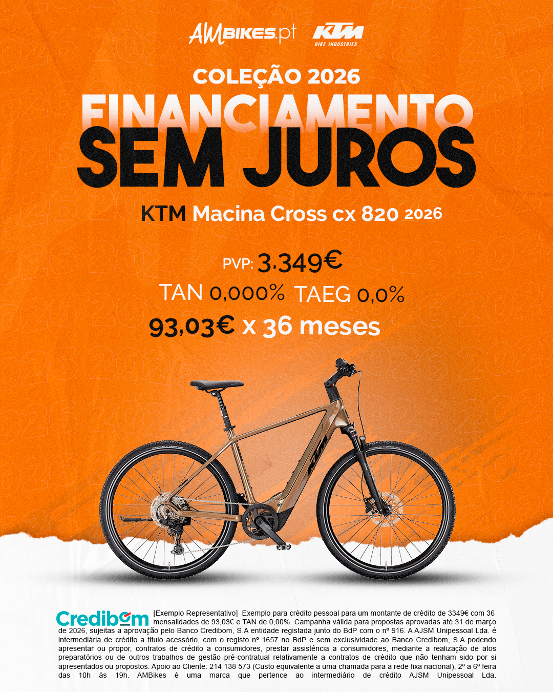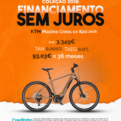 [Exemplo Representativo] Exemplo para crédito pessoal para um montante de crédito de 3.349,00 € com 36 mensalidades de 93,03 € e TAN de 0,00%. Campanha válida para propostas aprovadas até 31 de março de 2026, sujeitas a aprovação pelo Banco Credibom, S.A., entidade registada junto do BdP com o n.º 916. A AJSM Unipessoal Lda. é intermediária de crédito a título acessório, com o registo n.º 1657 no BdP e sem exclusividade ao Banco Credibom, S.A., podendo apresentar ou propor contratos de crédito a consumidores, prestar assistência a consumidores mediante a realização de atos preparatórios ou outros trabalhos de gestão pré-contratual relativamente a contratos de crédito que não tenham sido por si apresentados ou propostos. Apoio ao Cliente: 214 138 573 (chamada para a rede fixa nacional), 2ª a 6ª feira das 10h às 19h. AMBikes é uma marca que pertence ao intermediário de crédito AJSM Unipessoal Lda.