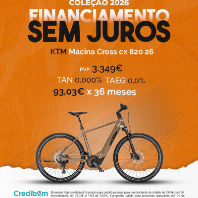 [Exemplo Representativo] Exemplo para crédito pessoal para um montante de crédito de 3.349,00 € com 36 mensalidades de 93,03 € e TAN de 0,00%. Campanha válida para propostas aprovadas até 31 de Dezembro de 2025, sujeitas a aprovação pelo Banco Credibom, S.A., entidade registada junto do BdP com o n.º 916. A AJSM Unipessoal Lda. é intermediária de crédito a título acessório, com o registo n.º 1657 no BdP e sem exclusividade ao Banco Credibom, S.A., podendo apresentar ou propor contratos de crédito a consumidores, prestar assistência a consumidores mediante a realização de atos preparatórios ou outros trabalhos de gestão pré-contratual relativamente a contratos de crédito que não tenham sido por si apresentados ou propostos. Apoio ao Cliente: 214 138 573 (chamada para a rede fixa nacional), 2ª a 6ª feira das 10h às 19h. AMBikes é uma marca que pertence ao intermediário de crédito AJSM Unipessoal Lda.