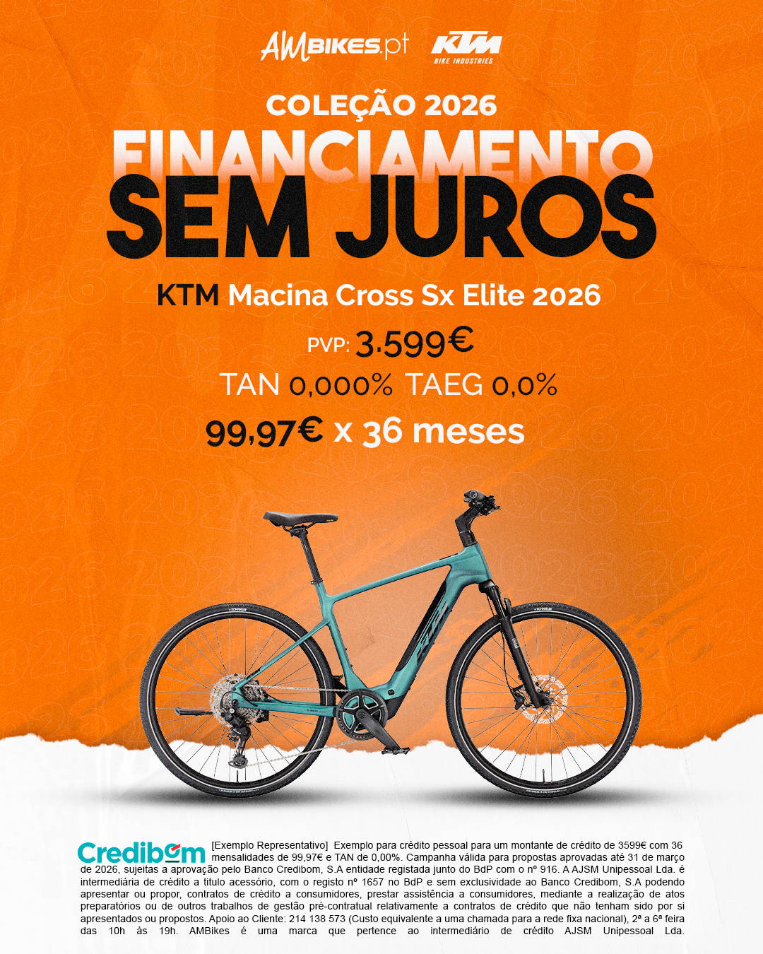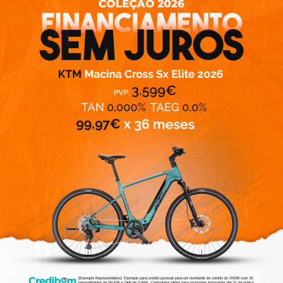 [Exemplo Representativo] Exemplo para crédito pessoal para um montante de crédito de 3.599,00 € com 36 mensalidades de 99,97 € e TAN de 0,00%. Campanha válida para propostas aprovadas até 31 de março de 2026, sujeitas a aprovação pelo Banco Credibom, S.A., entidade registada junto do BdP com o n.º 916. A AJSM Unipessoal Lda. é intermediária de crédito a título acessório, com o registo n.º 1657 no BdP e sem exclusividade ao Banco Credibom, S.A., podendo apresentar ou propor contratos de crédito a consumidores, prestar assistência a consumidores mediante a realização de atos preparatórios ou outros trabalhos de gestão pré-contratual relativamente a contratos de crédito que não tenham sido por si apresentados ou propostos. Apoio ao Cliente: 214 138 573 (chamada para a rede fixa nacional), 2ª a 6ª feira das 10h às 19h. AMBikes é uma marca que pertence ao intermediário de crédito AJSM Unipessoal Lda.