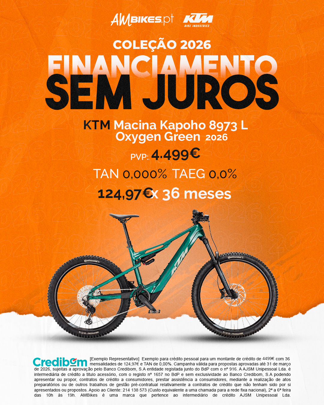 [Exemplo Representativo] Exemplo para crédito pessoal para um montante de crédito de 4.499,00 € com 36 mensalidades de 124,97 € e TAN de 0,00%. Campanha válida para propostas aprovadas até 31 de março de 2026, sujeitas a aprovação pelo Banco Credibom, S.A., entidade registada junto do BdP com o n.º 916. A AJSM Unipessoal Lda. é intermediária de crédito a título acessório, com o registo n.º 1657 no BdP e sem exclusividade ao Banco Credibom, S.A., podendo apresentar ou propor contratos de crédito a consumidores, prestar assistência a consumidores mediante a realização de atos preparatórios ou outros trabalhos de gestão pré-contratual relativamente a contratos de crédito que não tenham sido por si apresentados ou propostos. Apoio ao Cliente: 214 138 573 (chamada para a rede fixa nacional), 2ª a 6ª feira das 10h às 19h. AMBikes é uma marca que pertence ao intermediário de crédito AJSM Unipessoal Lda.