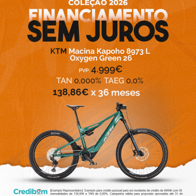 [Exemplo Representativo] Exemplo para crédito pessoal para um montante de crédito de 4.499,00 € com 36 mensalidades de 124,97 € e TAN de 0,00%. Campanha válida para propostas aprovadas até 31 de Dezembro de 2025, sujeitas a aprovação pelo Banco Credibom, S.A., entidade registada junto do BdP com o n.º 916. A AJSM Unipessoal Lda. é intermediária de crédito a título acessório, com o registo n.º 1657 no BdP e sem exclusividade ao Banco Credibom, S.A., podendo apresentar ou propor contratos de crédito a consumidores, prestar assistência a consumidores mediante a realização de atos preparatórios ou outros trabalhos de gestão pré-contratual relativamente a contratos de crédito que não tenham sido por si apresentados ou propostos. Apoio ao Cliente: 214 138 573 (chamada para a rede fixa nacional), 2ª a 6ª feira das 10h às 19h. AMBikes é uma marca que pertence ao intermediário de crédito AJSM Unipessoal Lda.