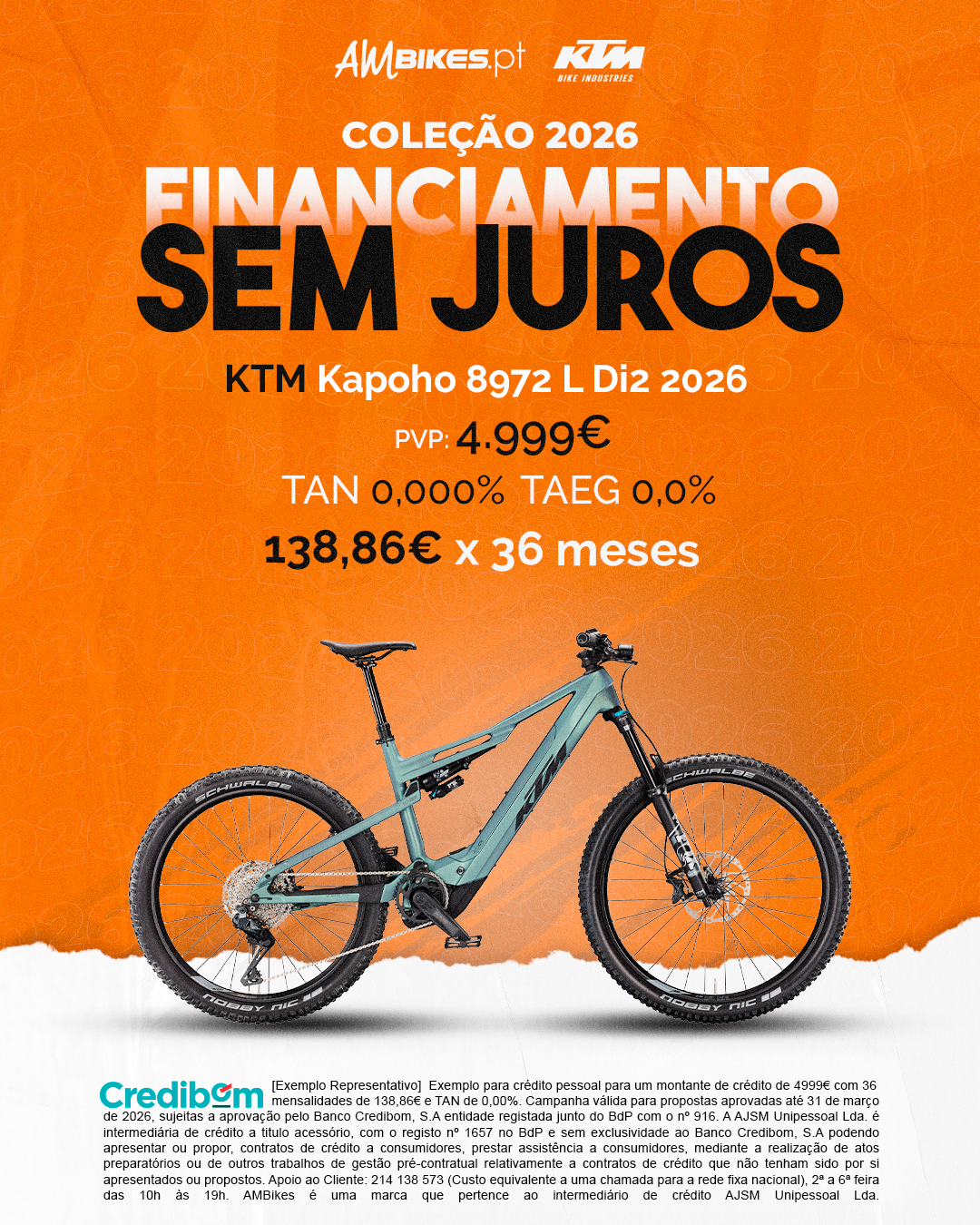 [Exemplo Representativo] Exemplo para crédito pessoal para um montante de crédito de 4.999,00 € com 36 mensalidades de 138,86 € e TAN de 0,00%. Campanha válida para propostas aprovadas até 31 de março de 2026, sujeitas a aprovação pelo Banco Credibom, S.A., entidade registada junto do BdP com o n.º 916. A AJSM Unipessoal Lda. é intermediária de crédito a título acessório, com o registo n.º 1657 no BdP e sem exclusividade ao Banco Credibom, S.A., podendo apresentar ou propor contratos de crédito a consumidores, prestar assistência a consumidores mediante a realização de atos preparatórios ou outros trabalhos de gestão pré-contratual relativamente a contratos de crédito que não tenham sido por si apresentados ou propostos. Apoio ao Cliente: 214 138 573 (chamada para a rede fixa nacional), 2ª a 6ª feira das 10h às 19h. AMBikes é uma marca que pertence ao intermediário de crédito AJSM Unipessoal Lda.