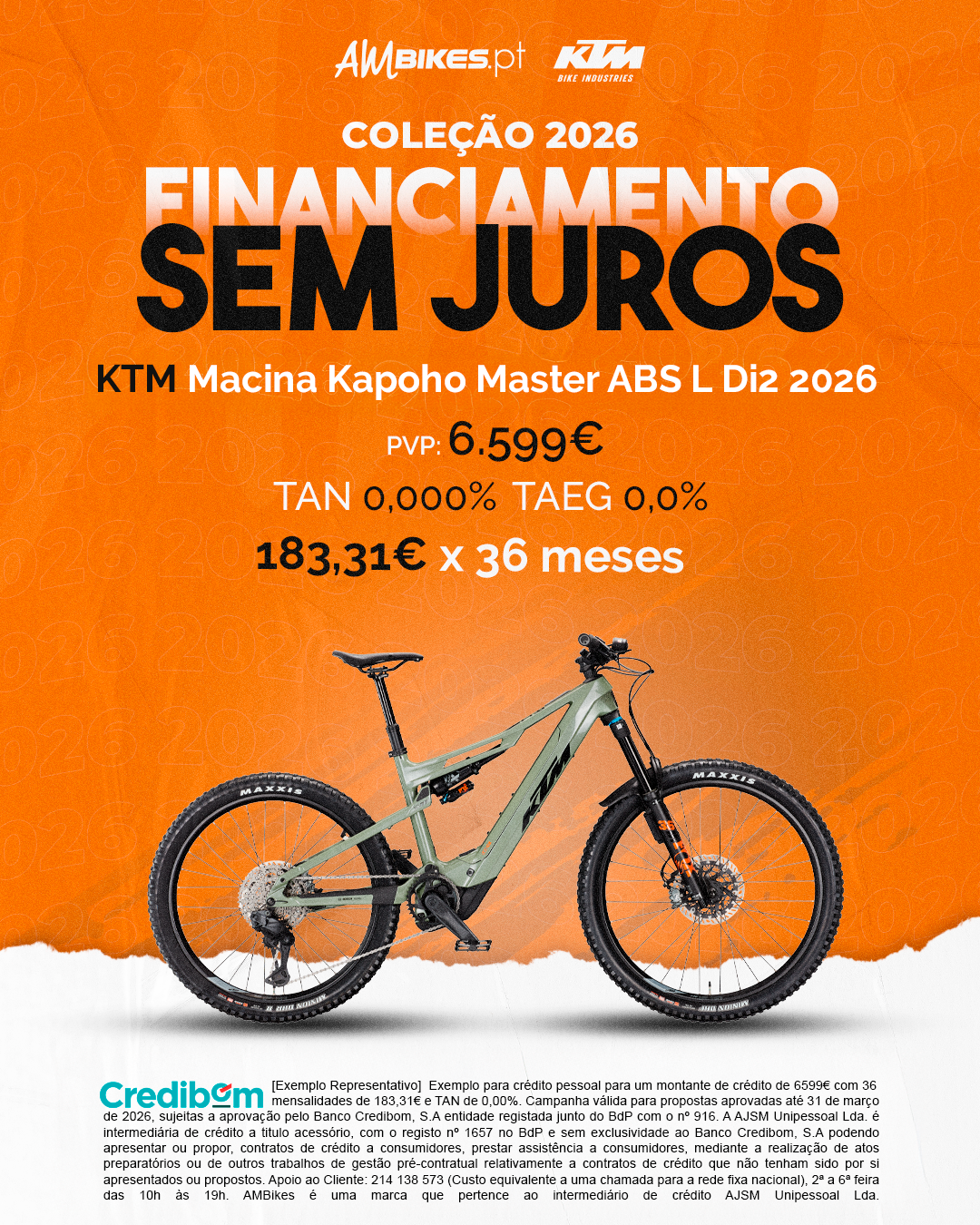 [Exemplo Representativo] Exemplo para crédito pessoal para um montante de crédito de 6.599,00 € com 36 mensalidades de 183,31 € e TAN de 0,00%. Campanha válida para propostas aprovadas até 31 de março de 2026, sujeitas a aprovação pelo Banco Credibom, S.A., entidade registada junto do BdP com o n.º 916. A AJSM Unipessoal Lda. é intermediária de crédito a título acessório, com o registo n.º 1657 no BdP e sem exclusividade ao Banco Credibom, S.A., podendo apresentar ou propor contratos de crédito a consumidores, prestar assistência a consumidores mediante a realização de atos preparatórios ou outros trabalhos de gestão pré-contratual relativamente a contratos de crédito que não tenham sido por si apresentados ou propostos. Apoio ao Cliente: 214 138 573 (chamada para a rede fixa nacional), 2ª a 6ª feira das 10h às 19h. AMBikes é uma marca que pertence ao intermediário de crédito AJSM Unipessoal Lda.