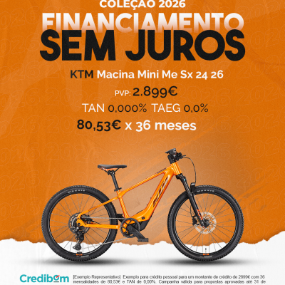[Exemplo Representativo] Exemplo para crédito pessoal para um montante de crédito de 2.899,00 € com 36 mensalidades de 80,53 € e TAN de 0,00%. Campanha válida para propostas aprovadas até 31 de Dezembro de 2025, sujeitas a aprovação pelo Banco Credibom, S.A., entidade registada junto do BdP com o n.º 916. A AJSM Unipessoal Lda. é intermediária de crédito a título acessório, com o registo n.º 1657 no BdP e sem exclusividade ao Banco Credibom, S.A., podendo apresentar ou propor contratos de crédito a consumidores, prestar assistência a consumidores mediante a realização de atos preparatórios ou outros trabalhos de gestão pré-contratual relativamente a contratos de crédito que não tenham sido por si apresentados ou propostos. Apoio ao Cliente: 214 138 573 (chamada para a rede fixa nacional), 2ª a 6ª feira das 10h às 19h. AMBikes é uma marca que pertence ao intermediário de crédito AJSM Unipessoal Lda.