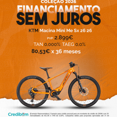 [Exemplo Representativo] Exemplo para crédito pessoal para um montante de crédito de 2.899,00 € com 36 mensalidades de 80,53 € e TAN de 0,00%. Campanha válida para propostas aprovadas até 31 de Dezembro de 2025, sujeitas a aprovação pelo Banco Credibom, S.A., entidade registada junto do BdP com o n.º 916. A AJSM Unipessoal Lda. é intermediária de crédito a título acessório, com o registo n.º 1657 no BdP e sem exclusividade ao Banco Credibom, S.A., podendo apresentar ou propor contratos de crédito a consumidores, prestar assistência a consumidores mediante a realização de atos preparatórios ou outros trabalhos de gestão pré-contratual relativamente a contratos de crédito que não tenham sido por si apresentados ou propostos. Apoio ao Cliente: 214 138 573 (chamada para a rede fixa nacional), 2ª a 6ª feira das 10h às 19h. AMBikes é uma marca que pertence ao intermediário de crédito AJSM Unipessoal Lda.