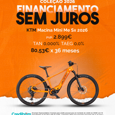 [Exemplo Representativo] Exemplo para crédito pessoal para um montante de crédito de 2.899,00 € com 36 mensalidades de 80,53 € e TAN de 0,00%. Campanha válida para propostas aprovadas até 31 de março de 2026, sujeitas a aprovação pelo Banco Credibom, S.A., entidade registada junto do BdP com o n.º 916. A AJSM Unipessoal Lda. é intermediária de crédito a título acessório, com o registo n.º 1657 no BdP e sem exclusividade ao Banco Credibom, S.A., podendo apresentar ou propor contratos de crédito a consumidores, prestar assistência a consumidores mediante a realização de atos preparatórios ou outros trabalhos de gestão pré-contratual relativamente a contratos de crédito que não tenham sido por si apresentados ou propostos. Apoio ao Cliente: 214 138 573 (chamada para a rede fixa nacional), 2ª a 6ª feira das 10h às 19h. AMBikes é uma marca que pertence ao intermediário de crédito AJSM Unipessoal Lda.