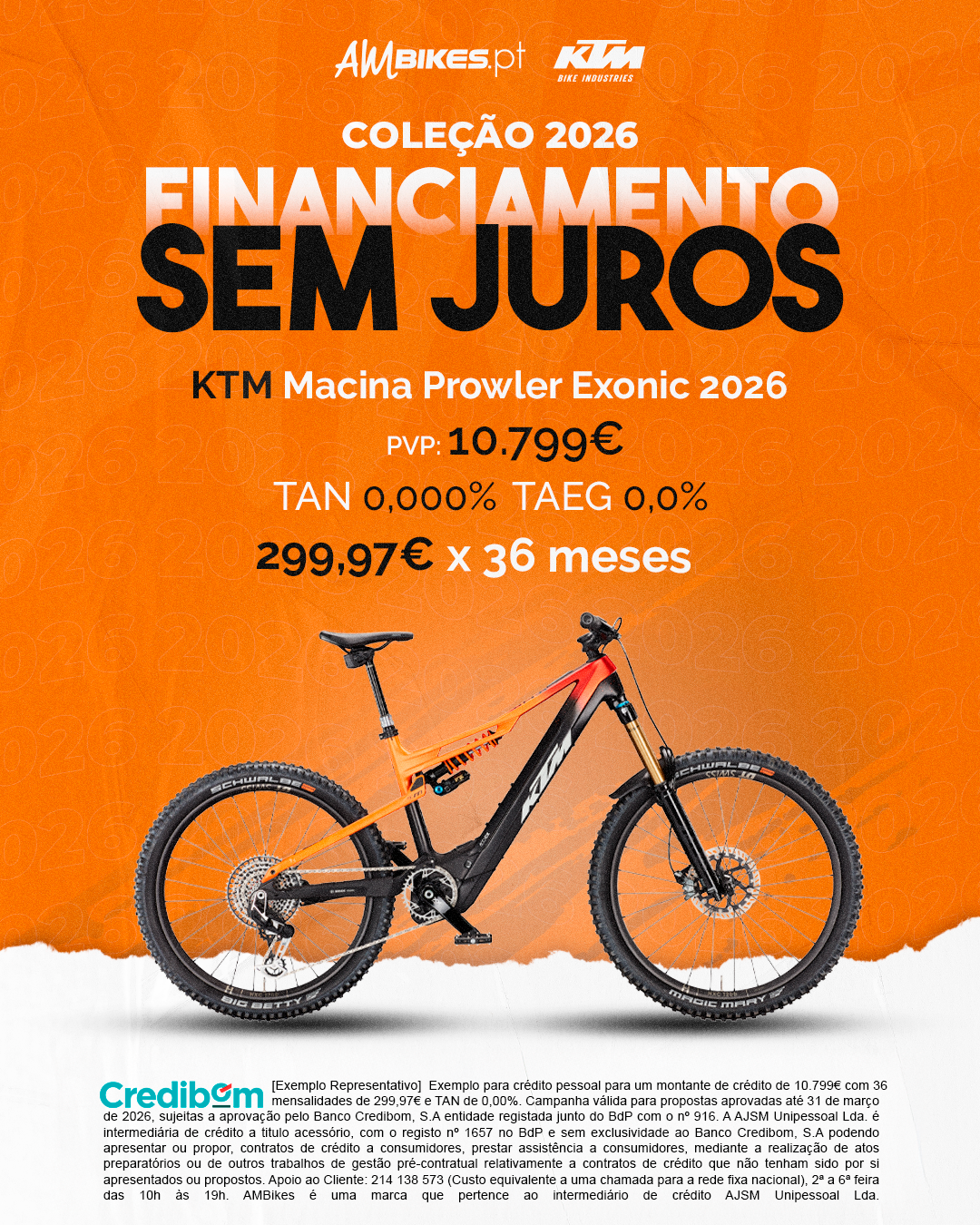 [Exemplo Representativo] Exemplo para crédito pessoal para um montante de crédito de 10.799,00 € com 36 mensalidades de 299,97 € e TAN de 0,00%. Campanha válida para propostas aprovadas até 31 de março de 2026, sujeitas a aprovação pelo Banco Credibom, S.A., entidade registada junto do BdP com o n.º 916. A AJSM Unipessoal Lda. é intermediária de crédito a título acessório, com o registo n.º 1657 no BdP e sem exclusividade ao Banco Credibom, S.A., podendo apresentar ou propor contratos de crédito a consumidores, prestar assistência a consumidores mediante a realização de atos preparatórios ou outros trabalhos de gestão pré-contratual relativamente a contratos de crédito que não tenham sido por si apresentados ou propostos. Apoio ao Cliente: 214 138 573 (chamada para a rede fixa nacional), 2ª a 6ª feira das 10h às 19h. AMBikes é uma marca que pertence ao intermediário de crédito AJSM Unipessoal Lda.