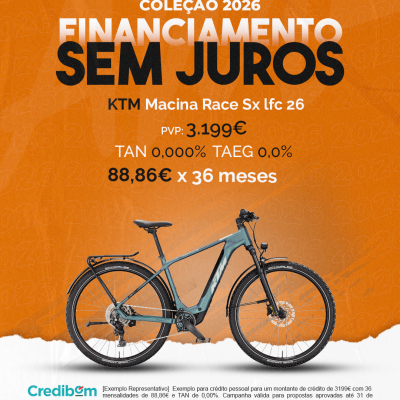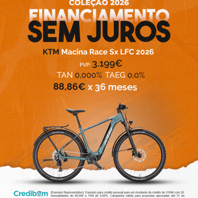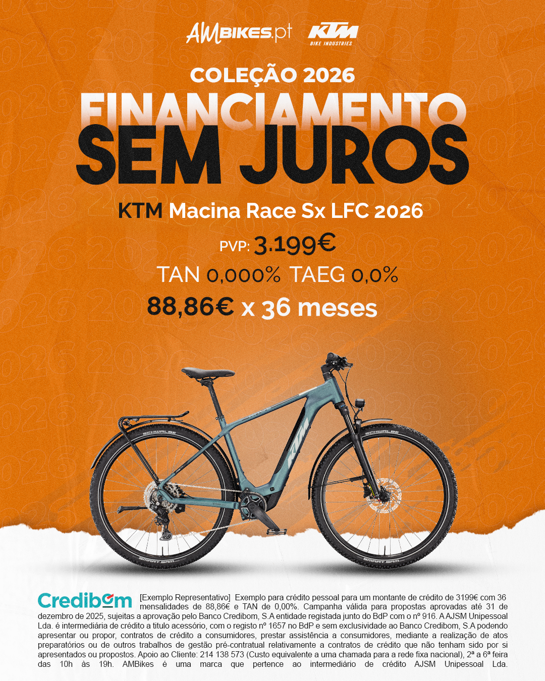 [Exemplo Representativo] Exemplo para crédito pessoal para um montante de crédito de 3.199,00 € com 36 mensalidades de 88,86 € e TAN de 0,00%. Campanha válida para propostas aprovadas até 31 de Dezembro de 2025, sujeitas a aprovação pelo Banco Credibom, S.A., entidade registada junto do BdP com o n.º 916. A AJSM Unipessoal Lda. é intermediária de crédito a título acessório, com o registo n.º 1657 no BdP e sem exclusividade ao Banco Credibom, S.A., podendo apresentar ou propor contratos de crédito a consumidores, prestar assistência a consumidores mediante a realização de atos preparatórios ou outros trabalhos de gestão pré-contratual relativamente a contratos de crédito que não tenham sido por si apresentados ou propostos. Apoio ao Cliente: 214 138 573 (chamada para a rede fixa nacional), 2ª a 6ª feira das 10h às 19h. AMBikes é uma marca que pertence ao intermediário de crédito AJSM Unipessoal Lda.