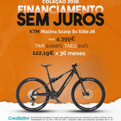 [Exemplo Representativo] Exemplo para crédito pessoal para um montante de crédito de 4.399,00 € com 36 mensalidades de 122,19 € e TAN de 0,00%. Campanha válida para propostas aprovadas até 31 de Dezembro de 2025, sujeitas a aprovação pelo Banco Credibom, S.A., entidade registada junto do BdP com o n.º 916. A AJSM Unipessoal Lda. é intermediária de crédito a título acessório, com o registo n.º 1657 no BdP e sem exclusividade ao Banco Credibom, S.A., podendo apresentar ou propor contratos de crédito a consumidores, prestar assistência a consumidores mediante a realização de atos preparatórios ou outros trabalhos de gestão pré-contratual relativamente a contratos de crédito que não tenham sido por si apresentados ou propostos. Apoio ao Cliente: 214 138 573 (chamada para a rede fixa nacional), 2ª a 6ª feira das 10h às 19h. AMBikes é uma marca que pertence ao intermediário de crédito AJSM Unipessoal Lda.