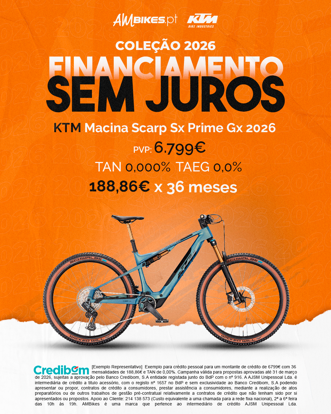 [Exemplo Representativo] Exemplo para crédito pessoal para um montante de crédito de 6.799,00 € com 36 mensalidades de 188,86 € e TAN de 0,00%. Campanha válida para propostas aprovadas até 31 de março de 2026, sujeitas a aprovação pelo Banco Credibom, S.A., entidade registada junto do BdP com o n.º 916. A AJSM Unipessoal Lda. é intermediária de crédito a título acessório, com o registo n.º 1657 no BdP e sem exclusividade ao Banco Credibom, S.A., podendo apresentar ou propor contratos de crédito a consumidores, prestar assistência a consumidores mediante a realização de atos preparatórios ou outros trabalhos de gestão pré-contratual relativamente a contratos de crédito que não tenham sido por si apresentados ou propostos. Apoio ao Cliente: 214 138 573 (chamada para a rede fixa nacional), 2ª a 6ª feira das 10h às 19h. AMBikes é uma marca que pertence ao intermediário de crédito AJSM Unipessoal Lda.