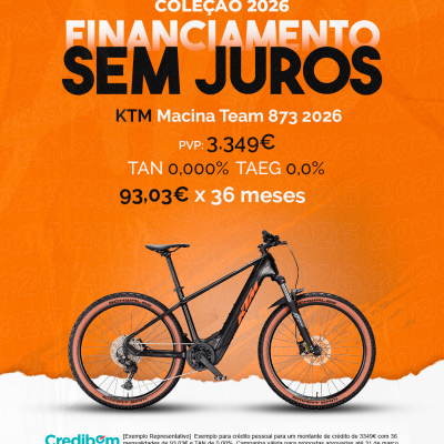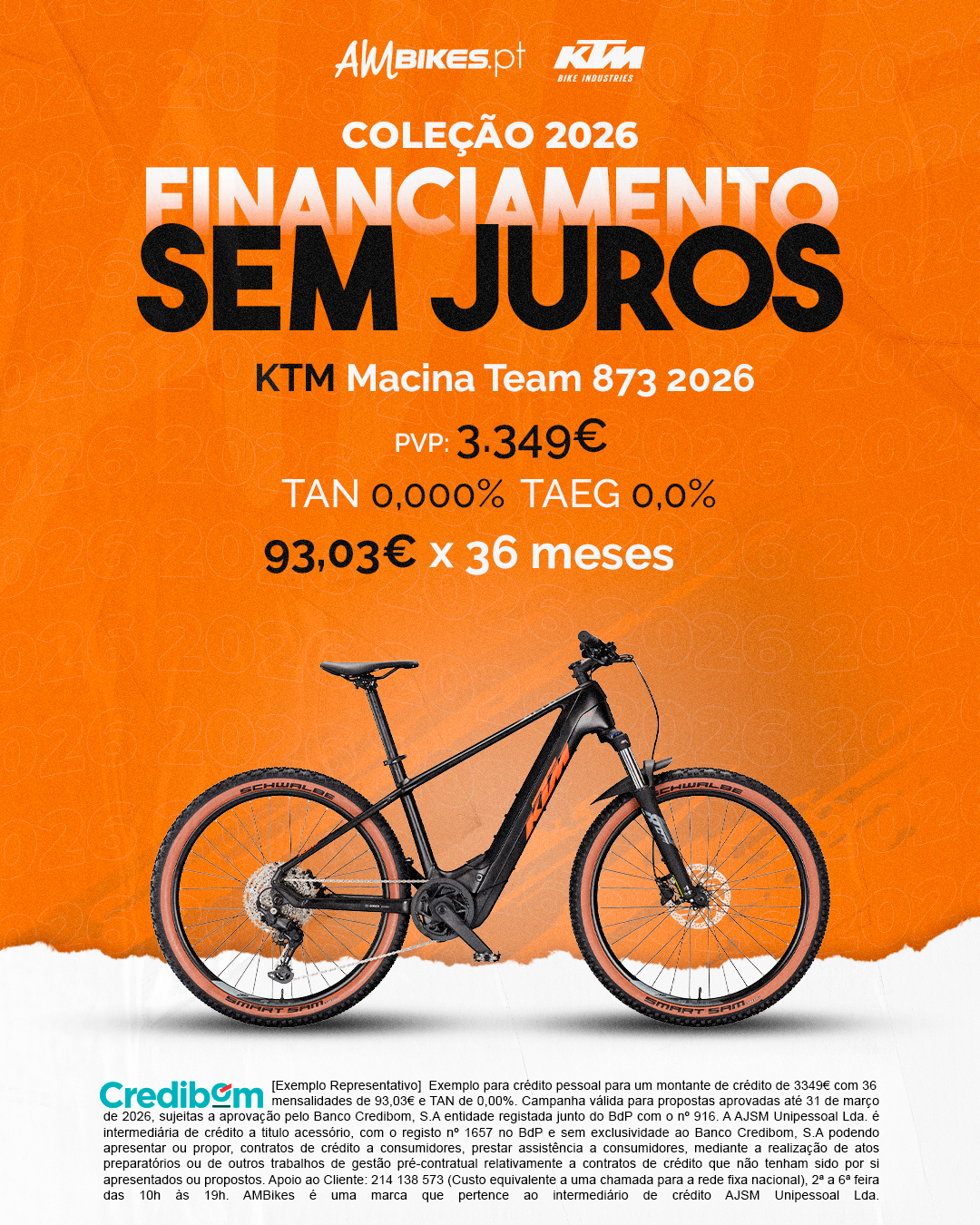 [Exemplo Representativo] Exemplo para crédito pessoal para um montante de crédito de 3.349,00 € com 36 mensalidades de 93,03 € e TAN de 0,00%. Campanha válida para propostas aprovadas até 31 de março de 2026, sujeitas a aprovação pelo Banco Credibom, S.A., entidade registada junto do BdP com o n.º 916. A AJSM Unipessoal Lda. é intermediária de crédito a título acessório, com o registo n.º 1657 no BdP e sem exclusividade ao Banco Credibom, S.A., podendo apresentar ou propor contratos de crédito a consumidores, prestar assistência a consumidores mediante a realização de atos preparatórios ou outros trabalhos de gestão pré-contratual relativamente a contratos de crédito que não tenham sido por si apresentados ou propostos. Apoio ao Cliente: 214 138 573 (chamada para a rede fixa nacional), 2ª a 6ª feira das 10h às 19h. AMBikes é uma marca que pertence ao intermediário de crédito AJSM Unipessoal Lda.