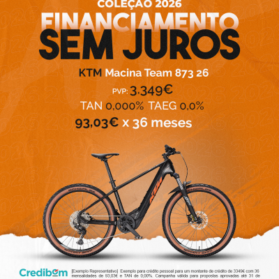 [Exemplo Representativo] Exemplo para crédito pessoal para um montante de crédito de 3.349,00 € com 36 mensalidades de 93,03 € e TAN de 0,00%. Campanha válida para propostas aprovadas até 31 de Dezembro de 2025, sujeitas a aprovação pelo Banco Credibom, S.A., entidade registada junto do BdP com o n.º 916. A AJSM Unipessoal Lda. é intermediária de crédito a título acessório, com o registo n.º 1657 no BdP e sem exclusividade ao Banco Credibom, S.A., podendo apresentar ou propor contratos de crédito a consumidores, prestar assistência a consumidores mediante a realização de atos preparatórios ou outros trabalhos de gestão pré-contratual relativamente a contratos de crédito que não tenham sido por si apresentados ou propostos. Apoio ao Cliente: 214 138 573 (chamada para a rede fixa nacional), 2ª a 6ª feira das 10h às 19h. AMBikes é uma marca que pertence ao intermediário de crédito AJSM Unipessoal Lda.