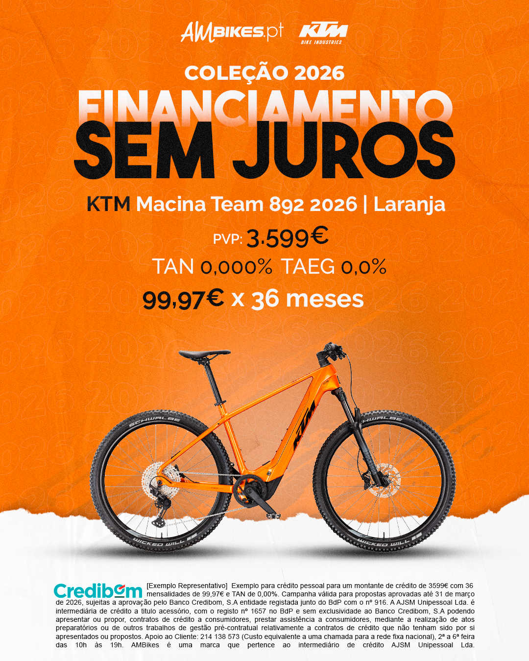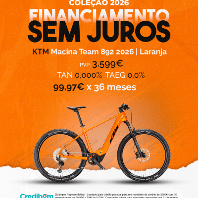 [Exemplo Representativo] Exemplo para crédito pessoal para um montante de crédito de 3.599,00 € com 36 mensalidades de 99,97 € e TAN de 0,00%. Campanha válida para propostas aprovadas até 31 de março de 2026, sujeitas a aprovação pelo Banco Credibom, S.A., entidade registada junto do BdP com o n.º 916. A AJSM Unipessoal Lda. é intermediária de crédito a título acessório, com o registo n.º 1657 no BdP e sem exclusividade ao Banco Credibom, S.A., podendo apresentar ou propor contratos de crédito a consumidores, prestar assistência a consumidores mediante a realização de atos preparatórios ou outros trabalhos de gestão pré-contratual relativamente a contratos de crédito que não tenham sido por si apresentados ou propostos. Apoio ao Cliente: 214 138 573 (chamada para a rede fixa nacional), 2ª a 6ª feira das 10h às 19h. AMBikes é uma marca que pertence ao intermediário de crédito AJSM Unipessoal Lda.