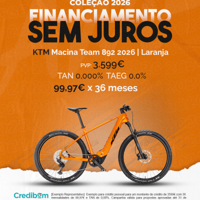 [Exemplo Representativo] Exemplo para crédito pessoal para um montante de crédito de 3.599,00 € com 36 mensalidades de 99,97 € e TAN de 0,00%. Campanha válida para propostas aprovadas até 31 de Dezembro de 2025, sujeitas a aprovação pelo Banco Credibom, S.A., entidade registada junto do BdP com o n.º 916. A AJSM Unipessoal Lda. é intermediária de crédito a título acessório, com o registo n.º 1657 no BdP e sem exclusividade ao Banco Credibom, S.A., podendo apresentar ou propor contratos de crédito a consumidores, prestar assistência a consumidores mediante a realização de atos preparatórios ou outros trabalhos de gestão pré-contratual relativamente a contratos de crédito que não tenham sido por si apresentados ou propostos. Apoio ao Cliente: 214 138 573 (chamada para a rede fixa nacional), 2ª a 6ª feira das 10h às 19h. AMBikes é uma marca que pertence ao intermediário de crédito AJSM Unipessoal Lda.