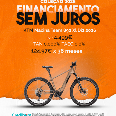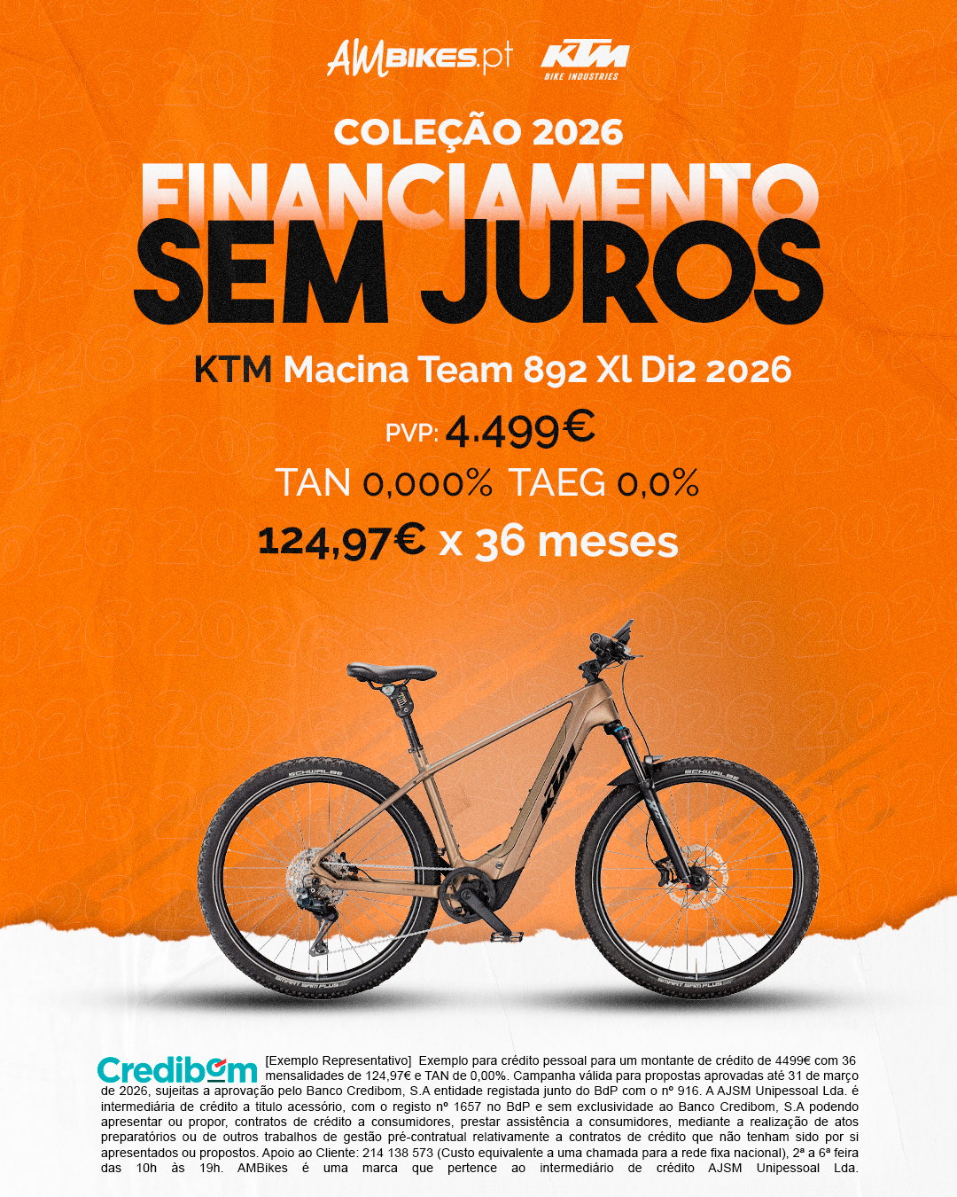 [Exemplo Representativo] Exemplo para crédito pessoal para um montante de crédito de 4.499,00 € com 36 mensalidades de 124,97 € e TAN de 0,00%. Campanha válida para propostas aprovadas até 31 de março de 2026, sujeitas a aprovação pelo Banco Credibom, S.A., entidade registada junto do BdP com o n.º 916. A AJSM Unipessoal Lda. é intermediária de crédito a título acessório, com o registo n.º 1657 no BdP e sem exclusividade ao Banco Credibom, S.A., podendo apresentar ou propor contratos de crédito a consumidores, prestar assistência a consumidores mediante a realização de atos preparatórios ou outros trabalhos de gestão pré-contratual relativamente a contratos de crédito que não tenham sido por si apresentados ou propostos. Apoio ao Cliente: 214 138 573 (chamada para a rede fixa nacional), 2ª a 6ª feira das 10h às 19h. AMBikes é uma marca que pertence ao intermediário de crédito AJSM Unipessoal Lda.