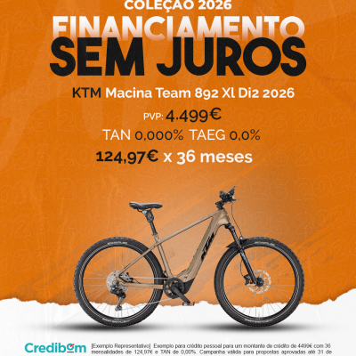 [Exemplo Representativo] Exemplo para crédito pessoal para um montante de crédito de 4.499,00 € com 36 mensalidades de 124,97 € e TAN de 0,00%. Campanha válida para propostas aprovadas até 31 de Dezembro de 2025, sujeitas a aprovação pelo Banco Credibom, S.A., entidade registada junto do BdP com o n.º 916. A AJSM Unipessoal Lda. é intermediária de crédito a título acessório, com o registo n.º 1657 no BdP e sem exclusividade ao Banco Credibom, S.A., podendo apresentar ou propor contratos de crédito a consumidores, prestar assistência a consumidores mediante a realização de atos preparatórios ou outros trabalhos de gestão pré-contratual relativamente a contratos de crédito que não tenham sido por si apresentados ou propostos. Apoio ao Cliente: 214 138 573 (chamada para a rede fixa nacional), 2ª a 6ª feira das 10h às 19h. AMBikes é uma marca que pertence ao intermediário de crédito AJSM Unipessoal Lda.