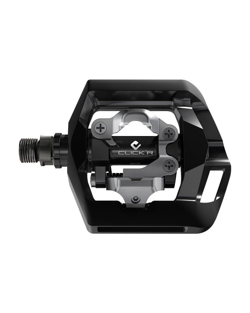 Os pedais Shimano T421 contam com a fixação Click'R de um lado e um pedal de plataforma do outro. A mola é mais leve gerando uma ancoragem fácil e cómoda. A tensão de ancoragem é ajustável, o eixo é de Cromoly e os rolamentos selados, garantindo uma alta durabilidade. São compatíveis com as travessas SPD e contam com um conjunto de travessas Shimano SM-SH56.