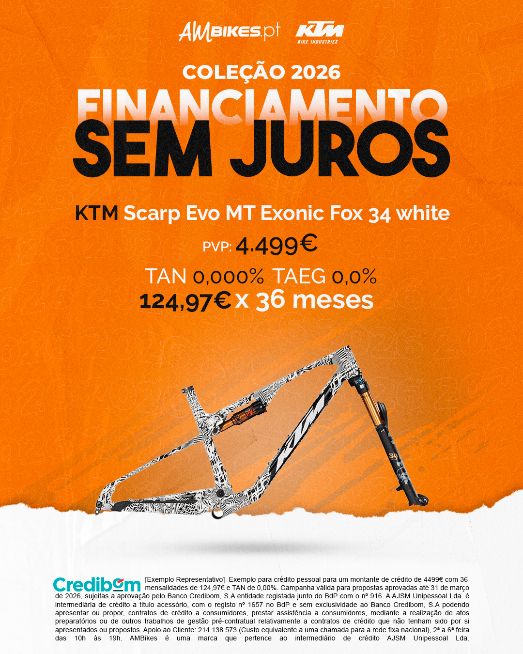 [Exemplo Representativo] Exemplo para crédito pessoal para um montante de crédito de 4.499,00€ com 36 mensalidades de 124,97€ e TAN de 0,00%. Campanha válida para propostas aprovadas até 31 de março de 2026, sujeitas a aprovação pelo Banco Credibom, S.A., entidade registada junto do BdP com o n.º 916. A AJSM Unipessoal Lda. é intermediária de crédito a título acessório, com o registo n.º 1657 no BdP e sem exclusividade ao Banco Credibom, S.A., podendo apresentar ou propor contratos de crédito a consumidores, prestar assistência a consumidores mediante a realização de atos preparatórios ou outros trabalhos de gestão pré-contratual relativamente a contratos de crédito que não tenham sido por si apresentados ou propostos. Apoio ao Cliente: 214 138 573 (chamada para a rede fixa nacional), 2ª a 6ª feira das 10h às 19h. AMBikes é uma marca que pertence ao intermediário de crédito AJSM Unipessoal Lda.