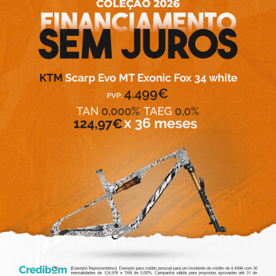 [Exemplo Representativo] Exemplo para crédito pessoal para um montante de crédito de 4.499,00€ com 36 mensalidades de 124,97€ e TAN de 0,00%. Campanha válida para propostas aprovadas até 31 de Dezembro de 2025, sujeitas a aprovação pelo Banco Credibom, S.A., entidade registada junto do BdP com o n.º 916. A AJSM Unipessoal Lda. é intermediária de crédito a título acessório, com o registo n.º 1657 no BdP e sem exclusividade ao Banco Credibom, S.A., podendo apresentar ou propor contratos de crédito a consumidores, prestar assistência a consumidores mediante a realização de atos preparatórios ou outros trabalhos de gestão pré-contratual relativamente a contratos de crédito que não tenham sido por si apresentados ou propostos. Apoio ao Cliente: 214 138 573 (chamada para a rede fixa nacional), 2ª a 6ª feira das 10h às 19h. AMBikes é uma marca que pertence ao intermediário de crédito AJSM Unipessoal Lda.