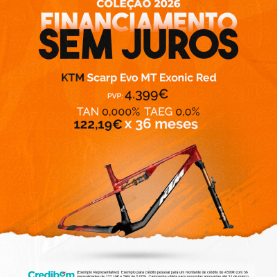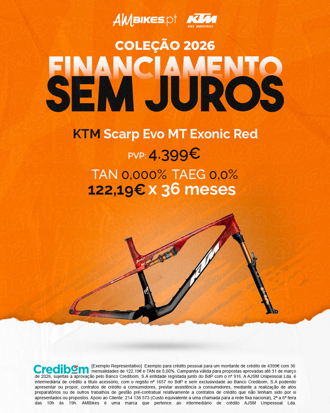 [Exemplo Representativo] Exemplo para crédito pessoal para um montante de crédito de 4.399,00 € com 36 mensalidades de 122,19€ e TAN de 0,00%. Campanha válida para propostas aprovadas até 31 de março de 2026, sujeitas a aprovação pelo Banco Credibom, S.A., entidade registada junto do BdP com o n.º 916. A AJSM Unipessoal Lda. é intermediária de crédito a título acessório, com o registo n.º 1657 no BdP e sem exclusividade ao Banco Credibom, S.A., podendo apresentar ou propor contratos de crédito a consumidores, prestar assistência a consumidores mediante a realização de atos preparatórios ou outros trabalhos de gestão pré-contratual relativamente a contratos de crédito que não tenham sido por si apresentados ou propostos. Apoio ao Cliente: 214 138 573 (chamada para a rede fixa nacional), 2ª a 6ª feira das 10h às 19h. AMBikes é uma marca que pertence ao intermediário de crédito AJSM Unipessoal Lda.